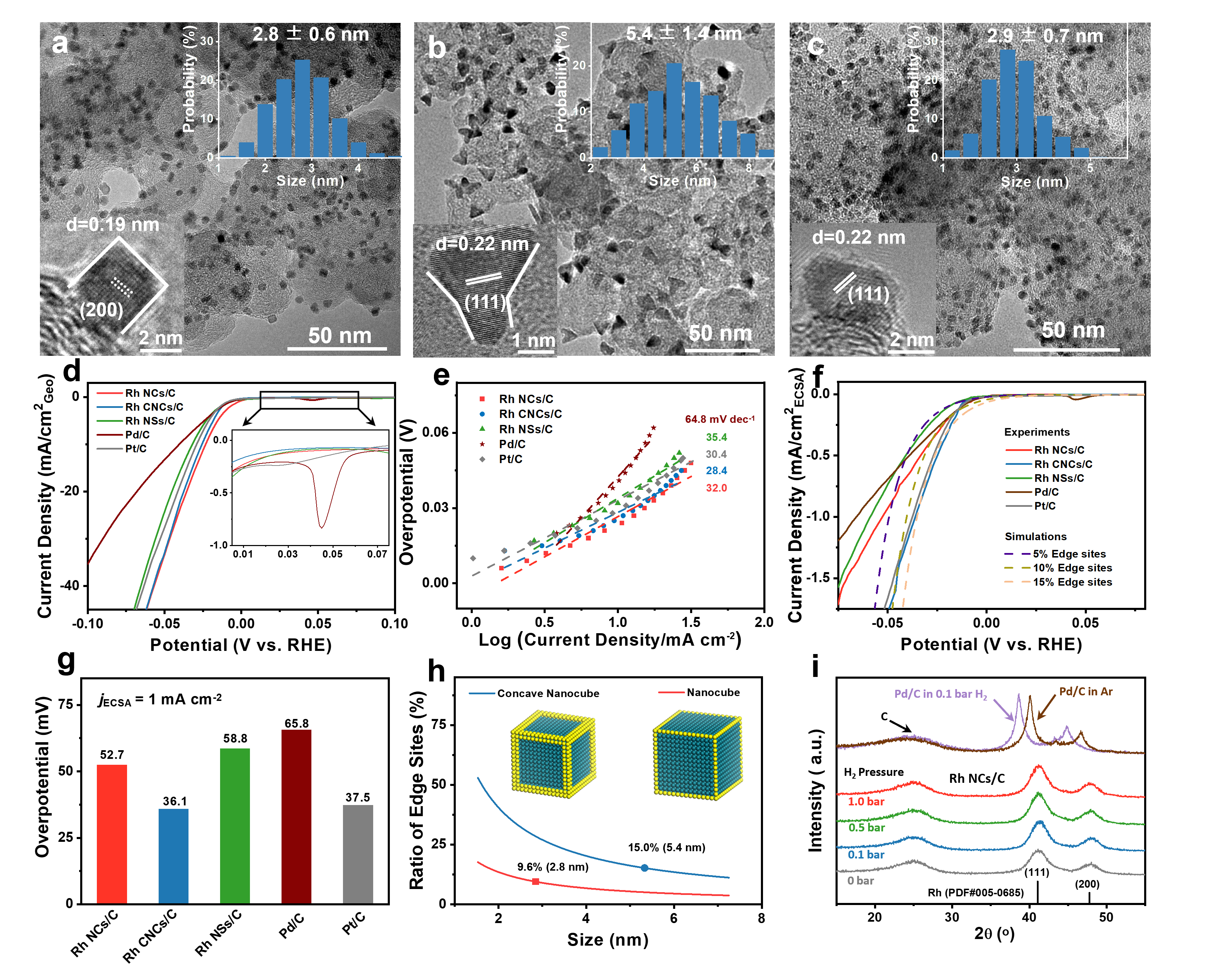最后,该研究团队通过实验合成了三种不同形貌的 Rh 纳米颗粒:Rh纳米方(Rh NCs)、凹陷的Rh纳米方(Rh CNCs)和Rh纳米球(Rh NSs),并进行了电化学 HER 测试。如图3所示,Rh CNCs因具有最高的边缘位点浓度,表现出最佳的 HER 活性,其Tafel 斜率为 28.4 mV dec⁻¹,过电位为 36.1 mV(j (ECSA) = 1 mA cm⁻²),优于商业 Pt/C 催化剂。另外,通过原位XRD表征,发现在常温下,将氢气分压增加到1bar时 Rh 的晶格仍未发生明显变化,这与理论预测一致,排除了 Rh 氢化物的生成可能性。