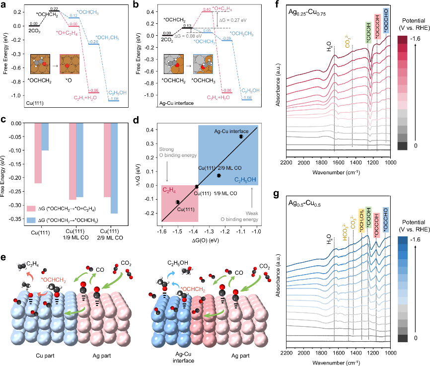 研究人员通过设计银-铜双相异质结构催化剂,揭示了中间体*CO调控界面动态重构对反应选择性的决定性作用。研究发现,在高浓度*CO作用下,铜原子向银表面迁移,形成丰富的银-铜界面,这种动态重构改变了界面的氧亲和性,显著影响反应路径。铜富集界面有利于乙烯生成,而银比例增加则促进醇类的形成。通过结合密度泛函理论(DFT)计算和多种表征技术,研究明确了*CO浓度驱动界面重构的机制,并提出双金属催化剂设计的新策略。该研究建立了双金属模型系统中动态结构重构的经验证明,并为理解CO2R电催化中的结构-功能相关性提供了一个范例。
