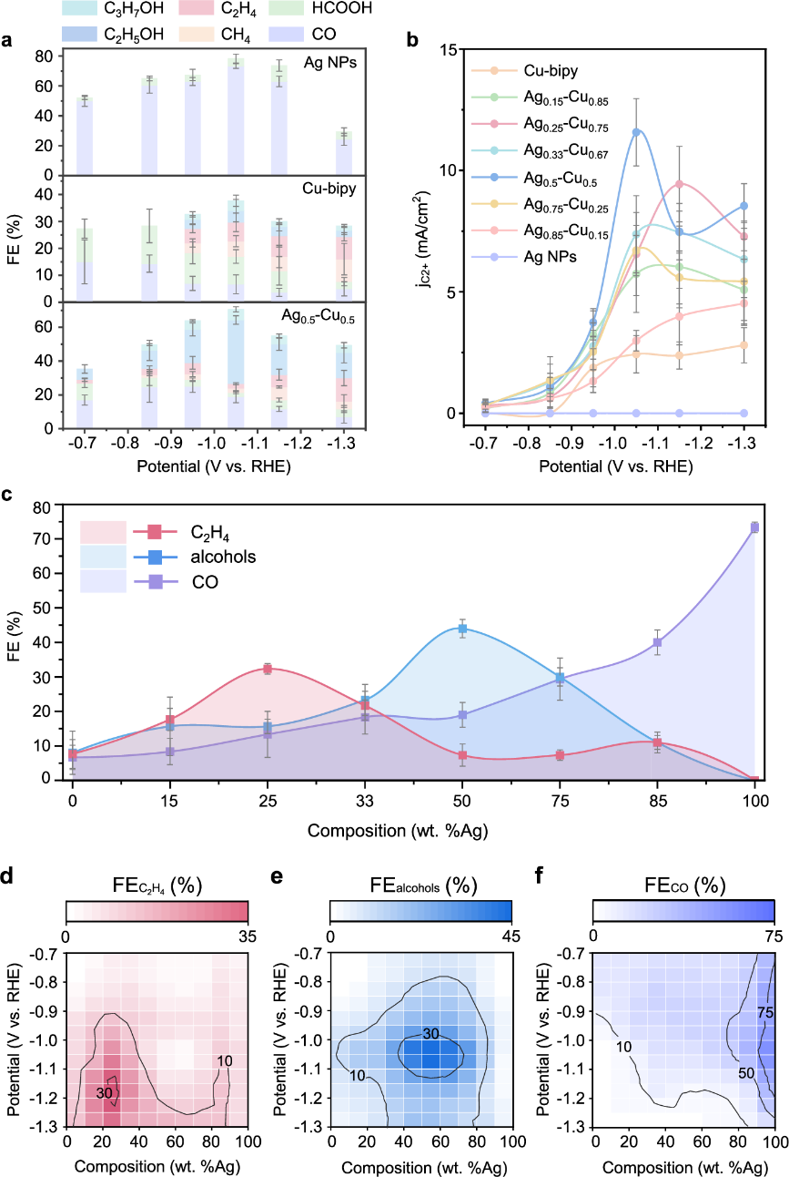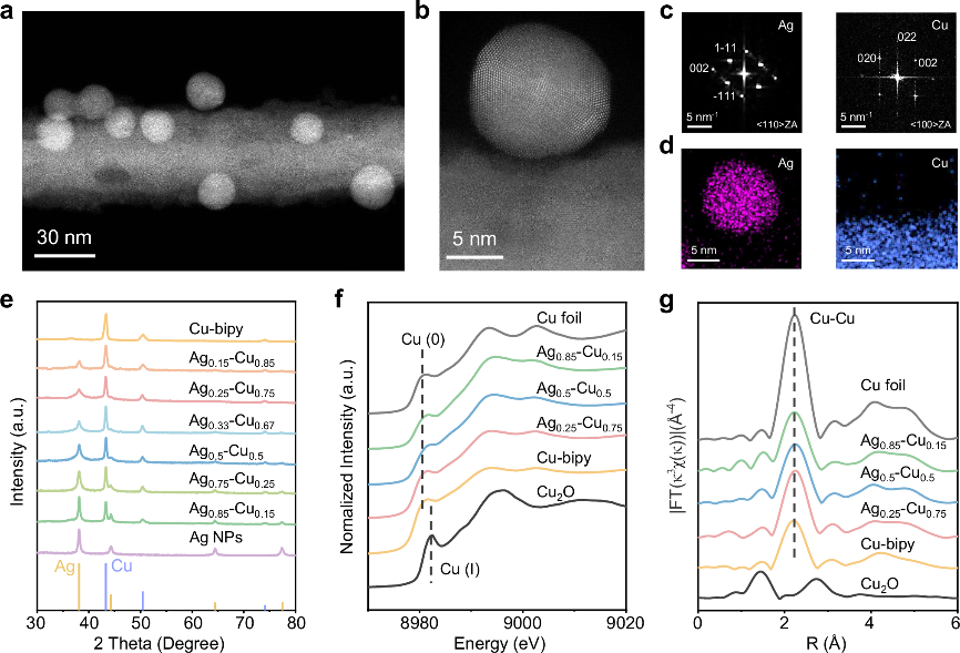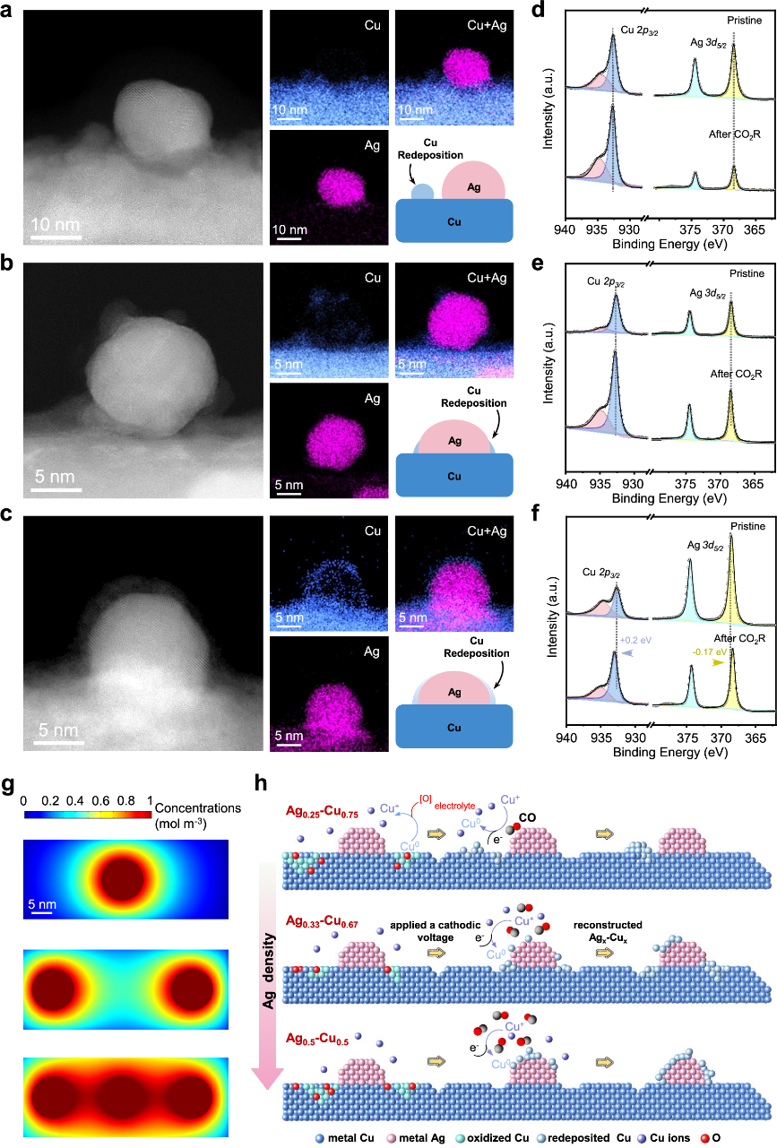 铜基催化剂因其独特的中间体(如*CO)吸附能力成为电催化CO2还原生成多碳产物的研究热点,但单金属铜催化剂的选择性受限于反应路径的标度关系,难以实现对多碳产物的精准调控。近年来,研究者通过引入第二种金属(如银)形成双金属体系,利用界面电子密度调控和晶格应变等协同效应,显著提升了C₂+产物选择性。然而,双金属界面在电解过程中会发生动态重构,其如何影响反应路径选择仍不清楚,限制了催化剂的理性设计。